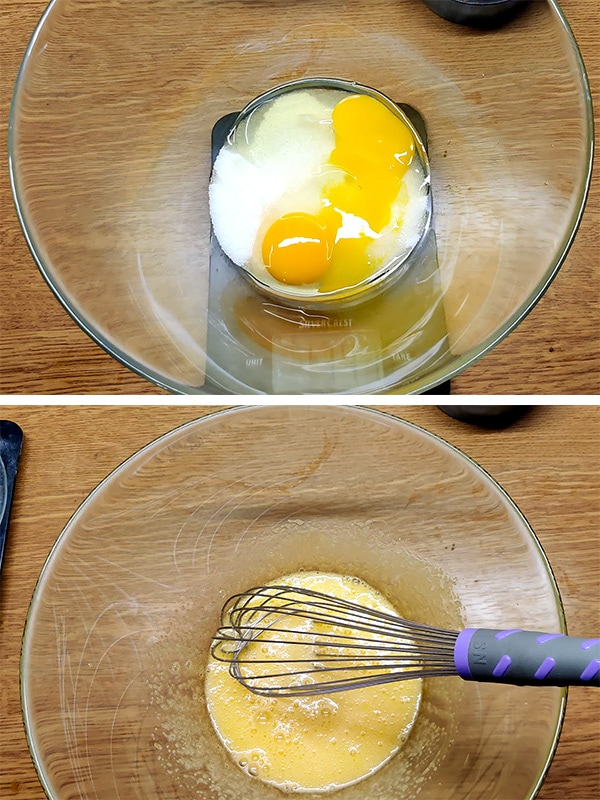 - Βάζουμε σε ένα μπολ τη ζάχαρη με τα αυγά και χτυπάμε με σύρμα μέχρι να λιώσει η ζάχαρη. Προσθέτουμε το λιωμένο βούτυρο και ανακατεύουμε.