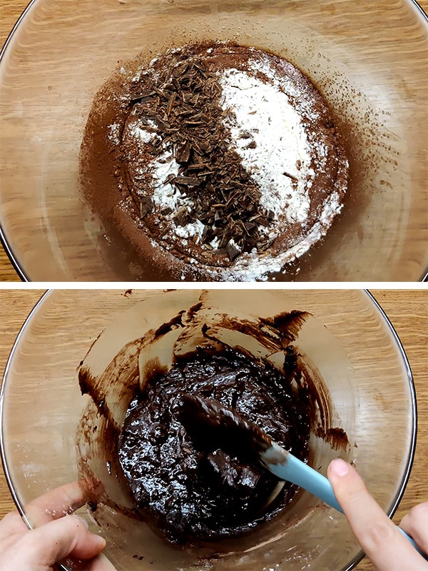 - Ρίχνουμε μέσα το κακάο, το αλεύρι, τη βανίλια, τη μισή κουβερτούρα και ανακατεύουμε με μαρίζ ή κουτάλι.