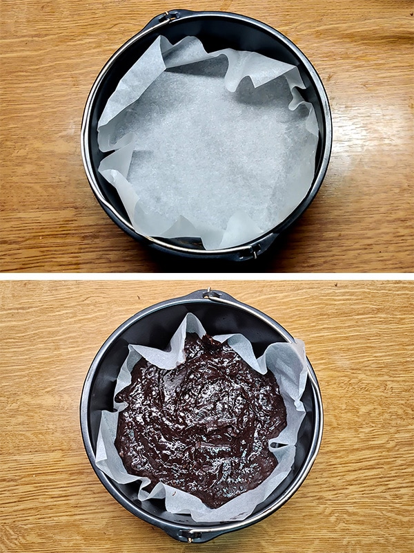 - Σε μια φόρμα 20 εκατοστών βάζουμε λαδόκολλα και ρίχνουμε μέσα το μείγμα.