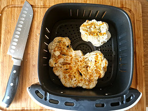 Ψημένο κουνουπίδι στη φριτέζα αέρος, μια υγιεινή και νόστιμη επιλογή για χορτοφάγους που θέλουν ένα γεύμα με κρέας. Έτοιμο σε λιγότερο από 20 λεπτά.